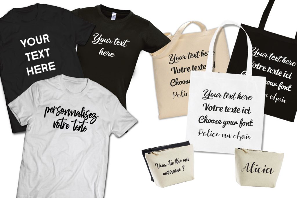 Envie de personnaliser vos textiles, nous vous proposons t-shirts, tote bags, trousses de maquillage, transferts thermocollants. Autant de produits que vous pourrez personnaliser selon vos envies. Rendez vous sur le shop La Fabrique Zen Choisissez votre produit :  T-shirts (cliquer ici) : choisissez la police d’écriture ainsi que sa couleur, puis communiquez nous votre texte …