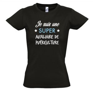 T-shirt Je suis une super auxiliaire de puériculture, couleur du texte à personnaliser