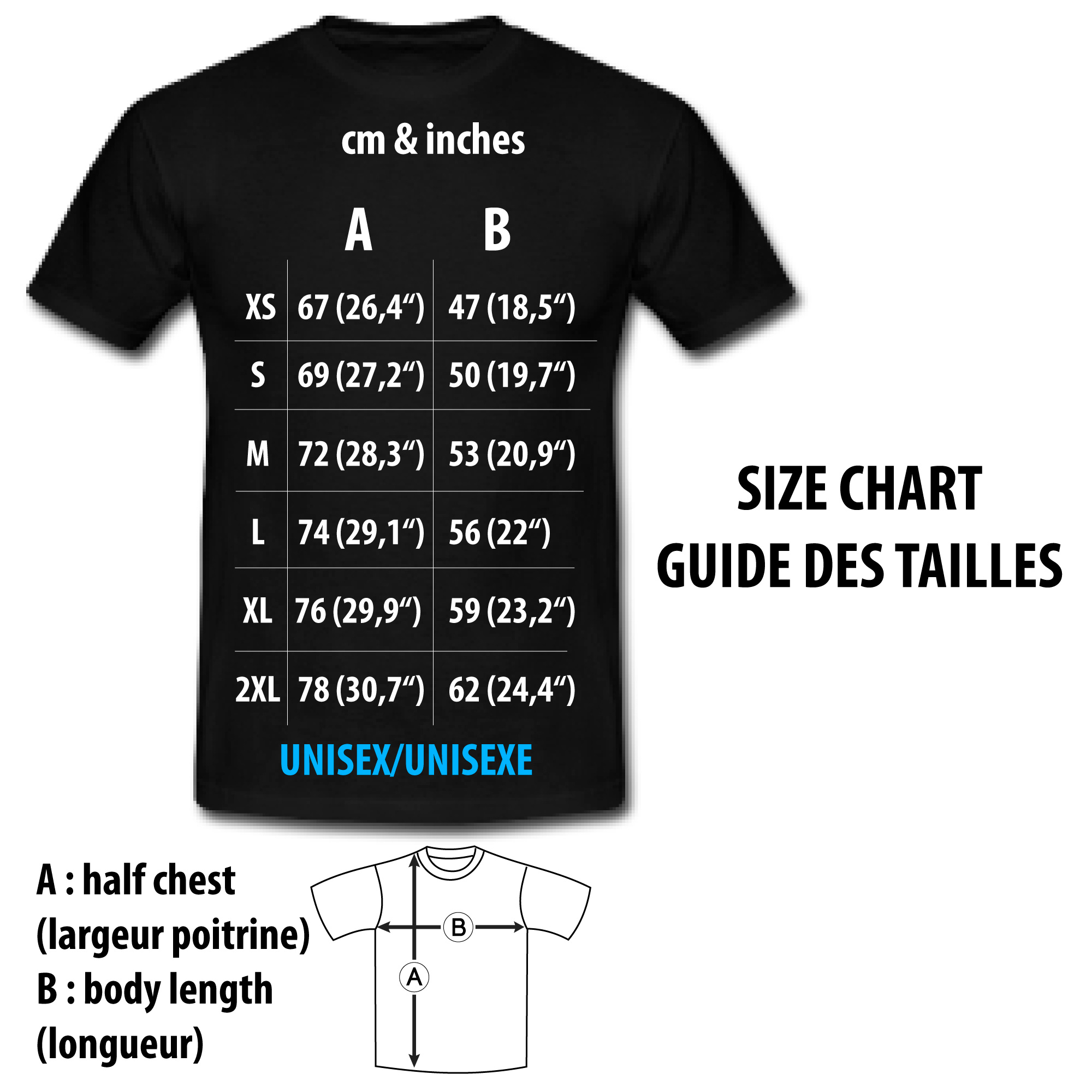Disponible en différentes tailles. Merci de consulter le guide des tailles (voir photo jointe). Les t-shirts sont des tailles US et sont assez amples. Pour une coupe ajustée plus près du corps, n’hésitez pas à prendre une taille en dessous.