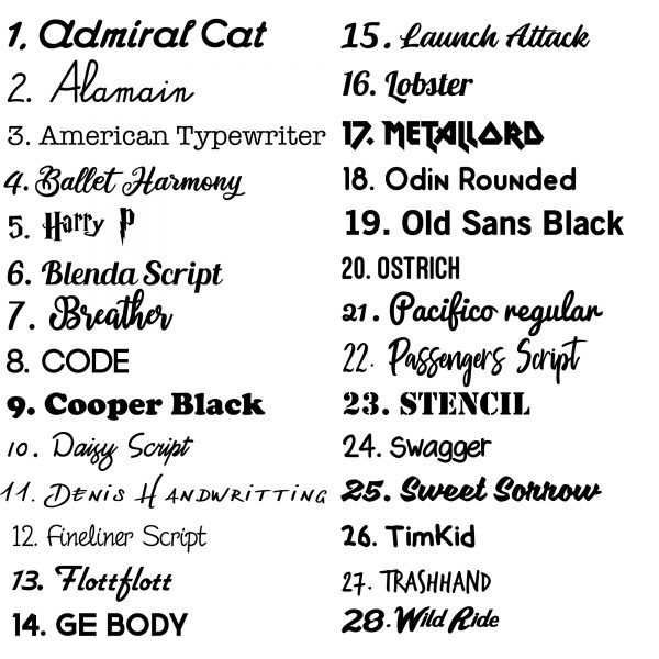 Personnalisez votre tote bag avec le texte de votre choix. Vous trouverez en image jointe différentes polices d’écriture. Vous pouvez également me fournir votre propre police d’écriture. N’oubliez pas de choisir la couleur du texte en vous aidant du nuancier fourni en image.